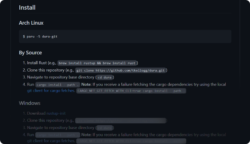 - Then, when you’re ready, follow the suitable README install steps for your OS on Dura’s homepage.